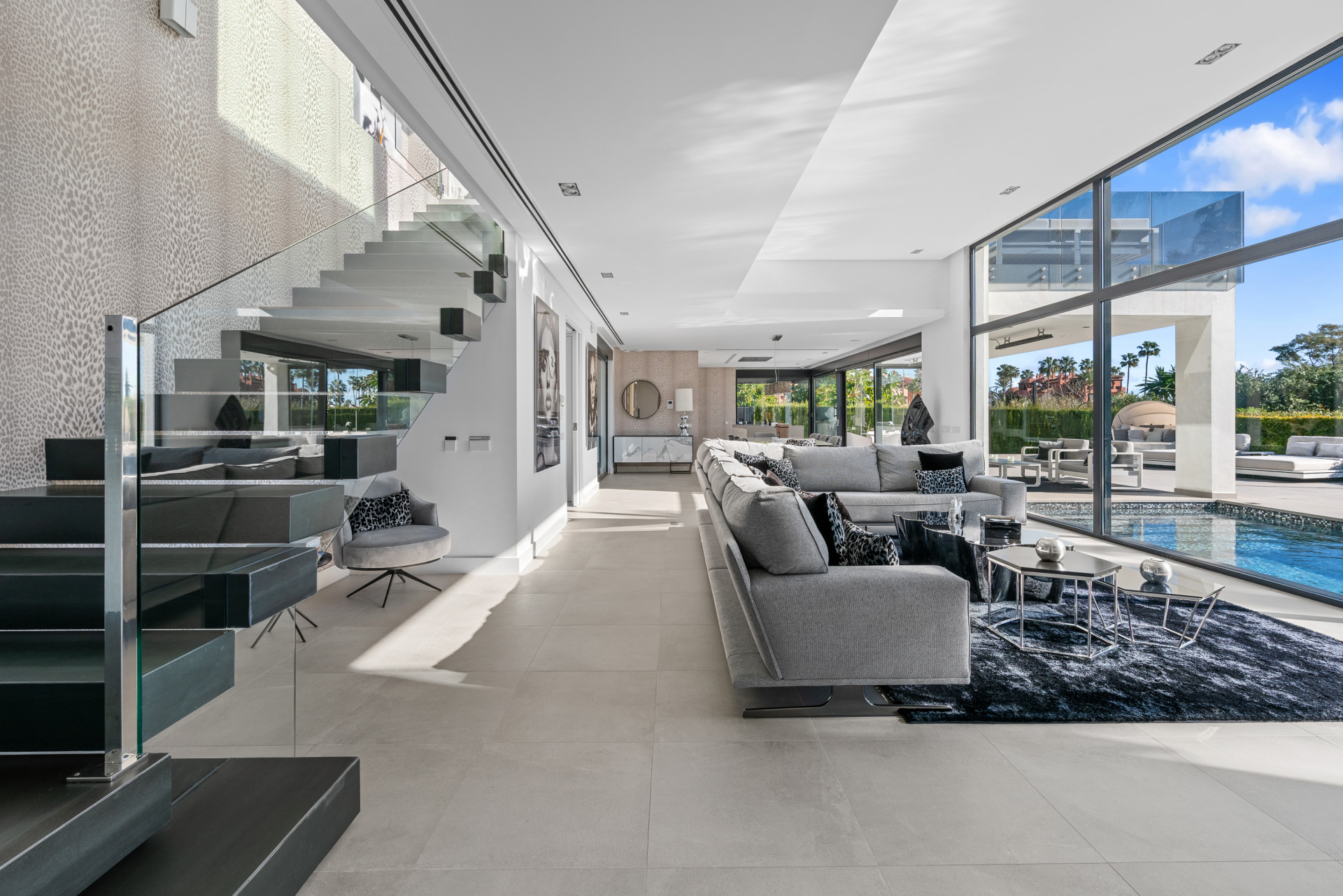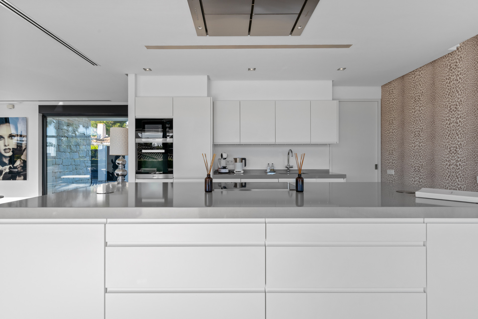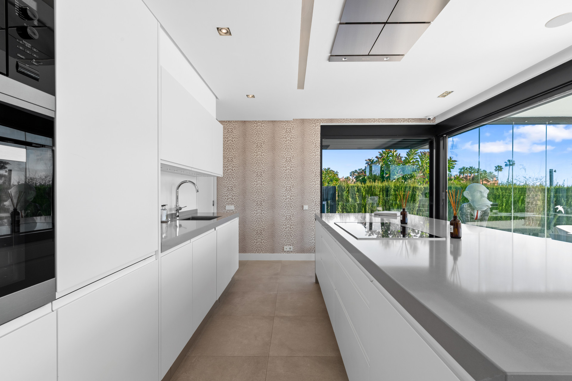 The property offers bright, open-plan living spaces with a double-height ceiling in the main lounge, creating a strong sense of volume and natural light throughout. The contemporary kitchen is fully fitted with high-quality Miele and Neff appliances and features a central island, with an adjacent utility room.