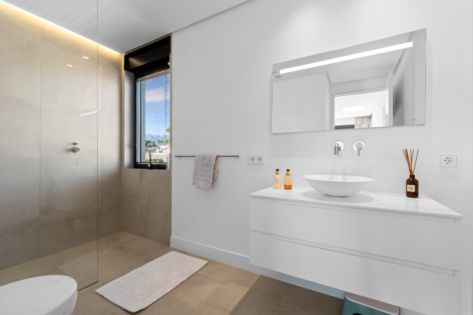 Accommodation comprises four generously sized en-suite bedrooms. The principal suite enjoys exceptional sea views and includes a luxurious bathroom with a walk-in shower, feature bathtub, and double basins. A guest cloakroom is located on the ground floor.