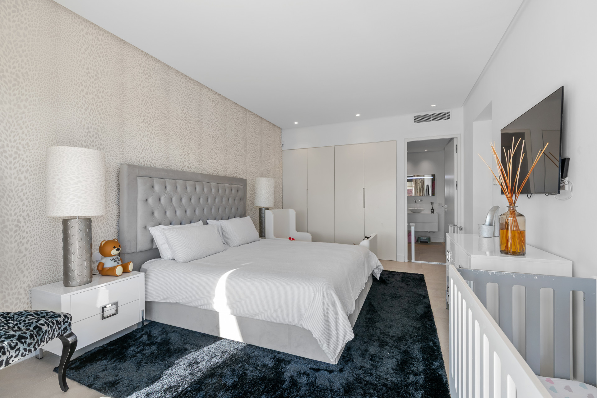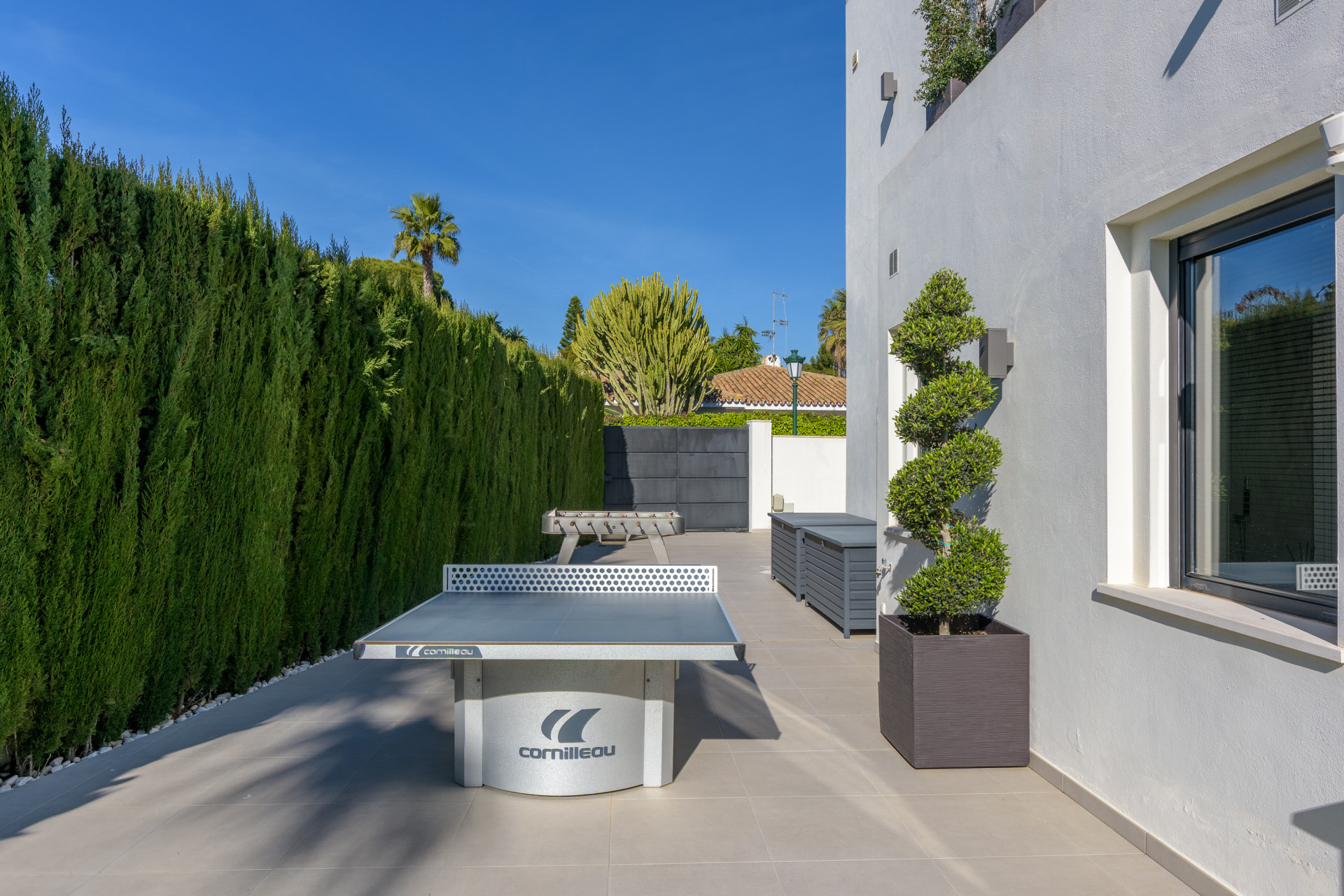 Externally, the home benefits from a spacious terrace with multiple entertaining areas, designed for low-maintenance living. The heated private swimming pool (8.40 x 3.60 m) includes a cover, and residents also have access to a communal swimming pool and landscaped gardens.
