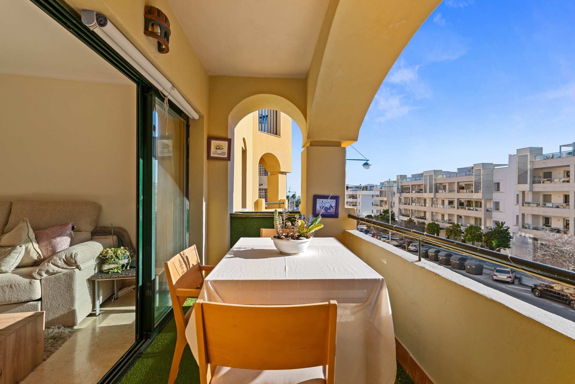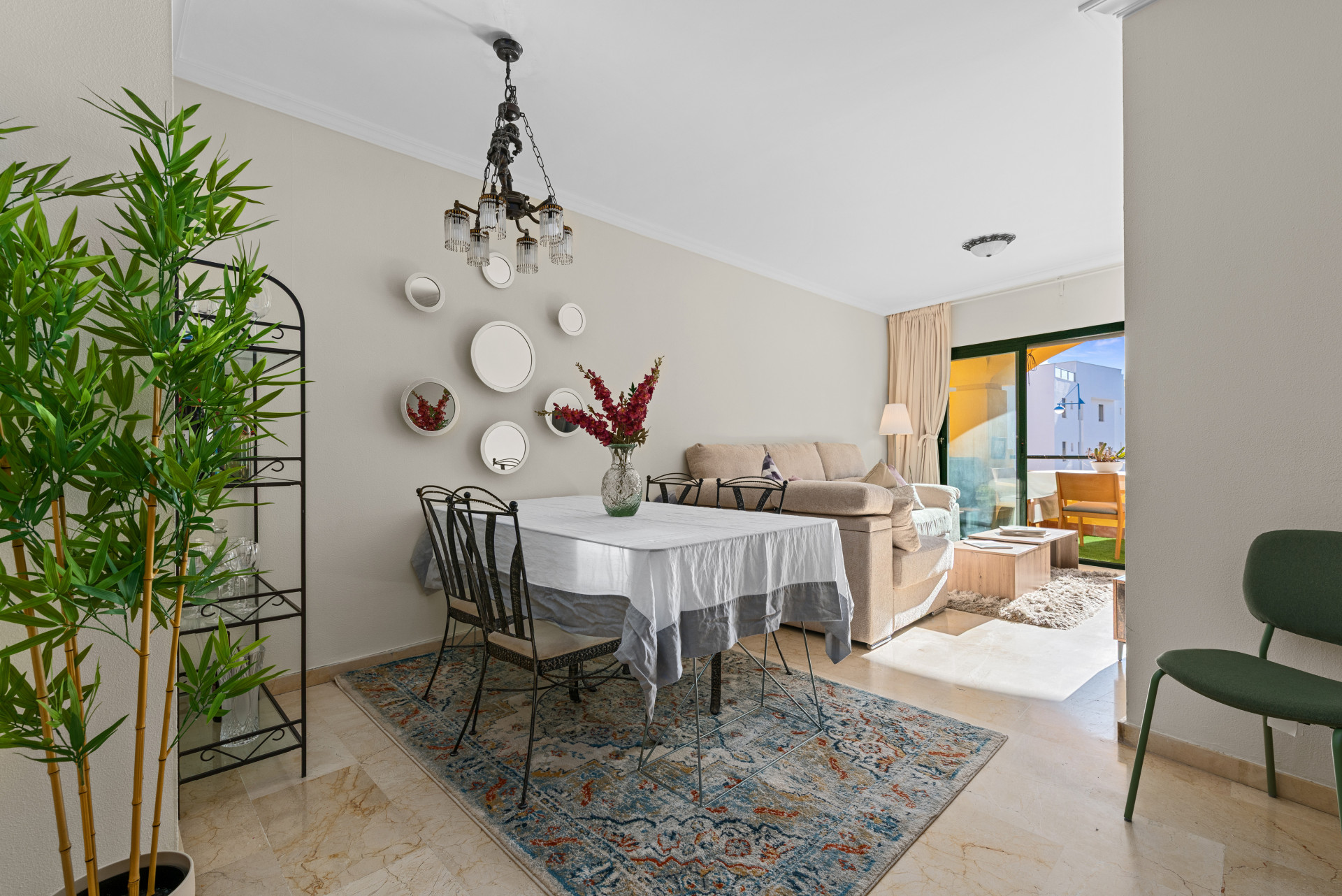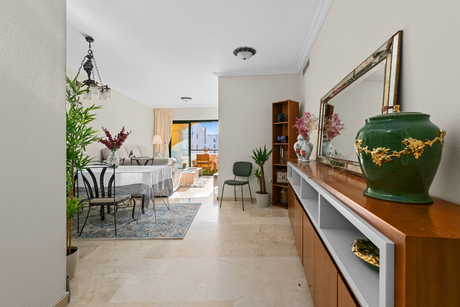 Well-presented three-bedroom apartment located in the established El Mirador community in Nueva Alcántara, within easy walking distance of the beach, boulevard, and all local amenities. The property offers a bright living and dining area with direct access to a covered west-facing terrace, providing good natural light throughout the afternoon and evening. The terrace is well-sized and suitable for outdoor dining.