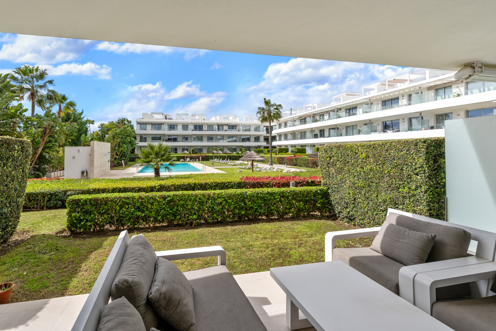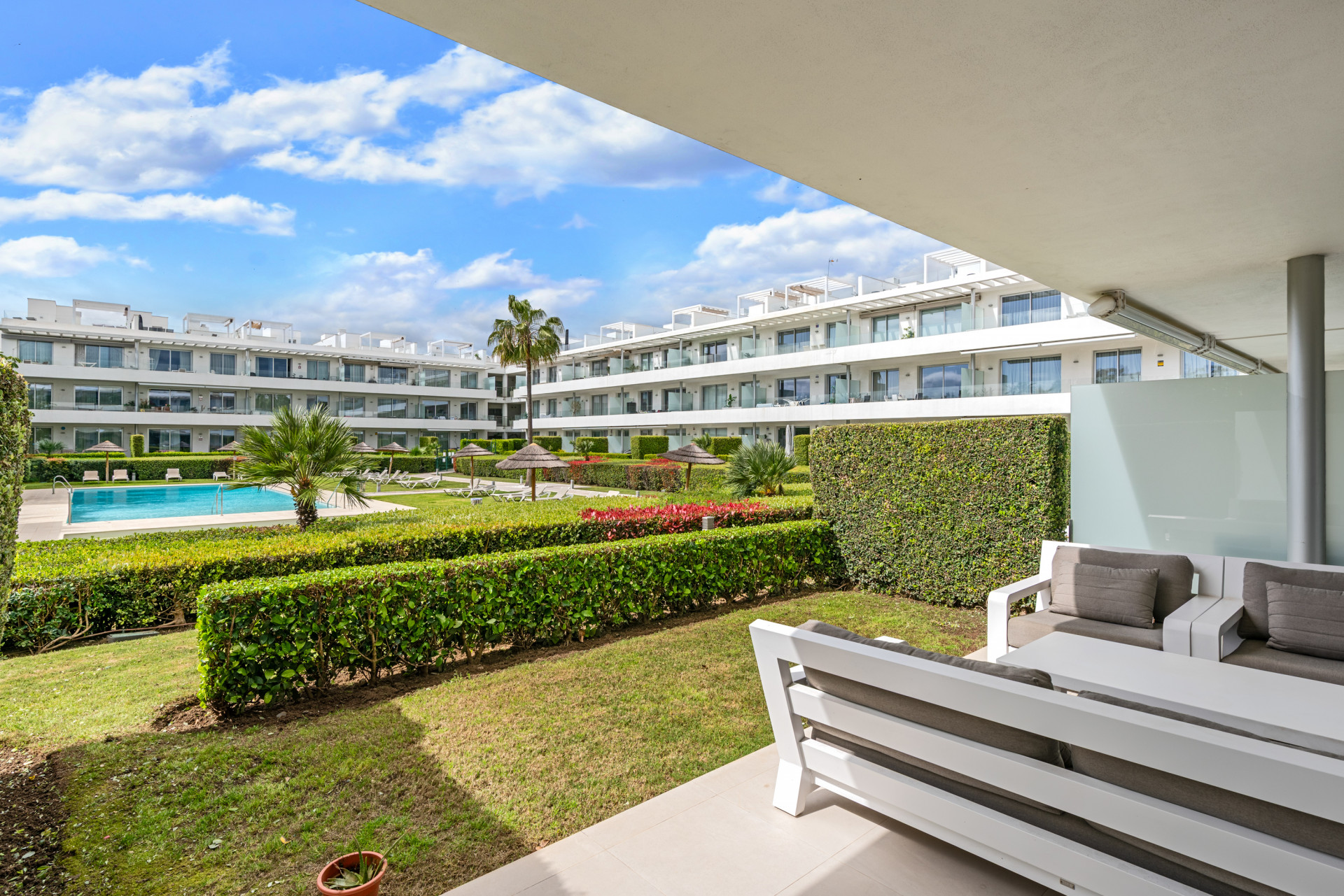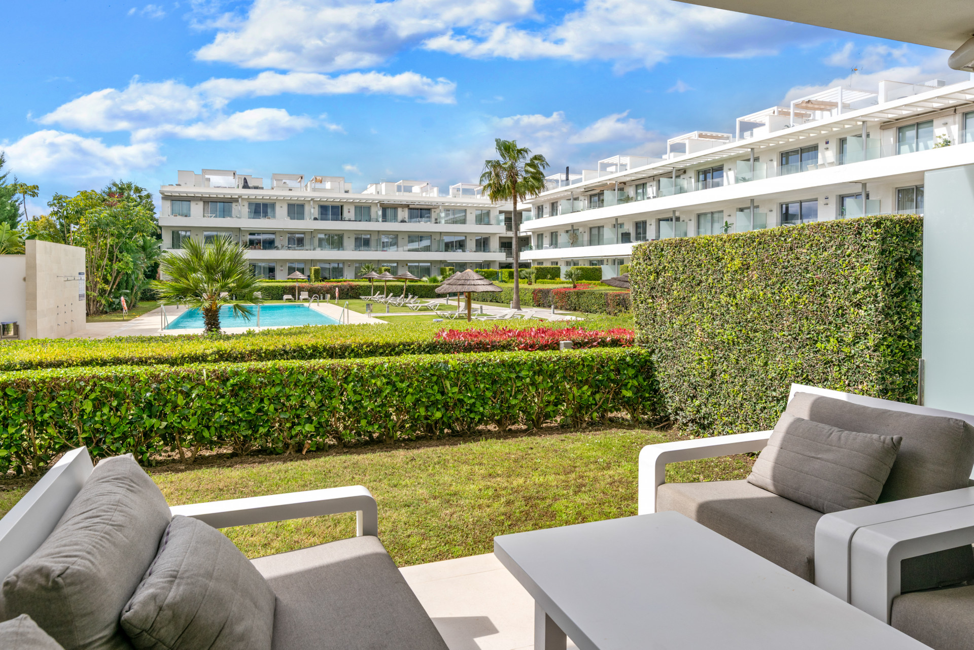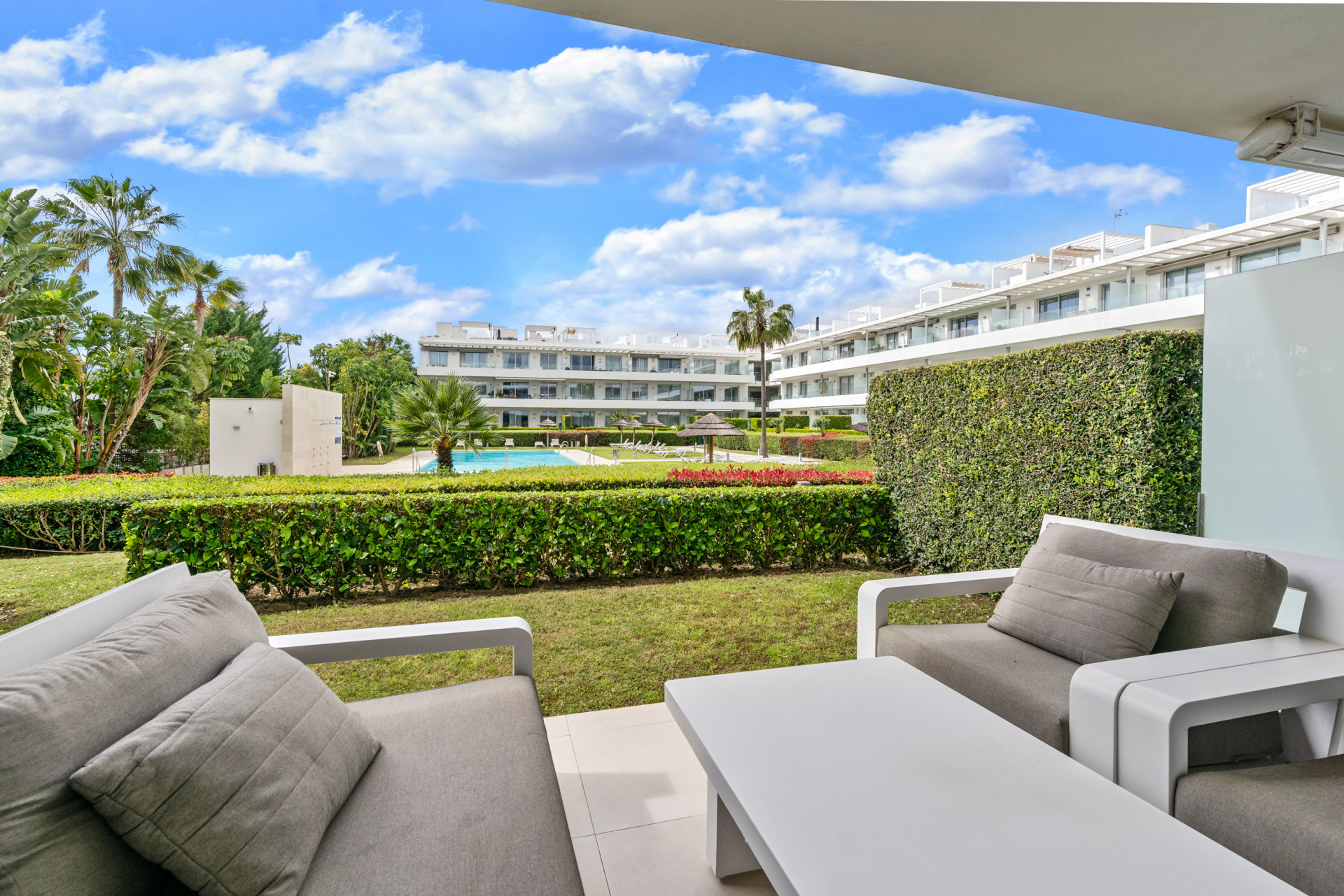 Modern, two bedroom, ground floor, west facing apartment with afternoon sunshine and direct access to the community gardens and swimming pool.