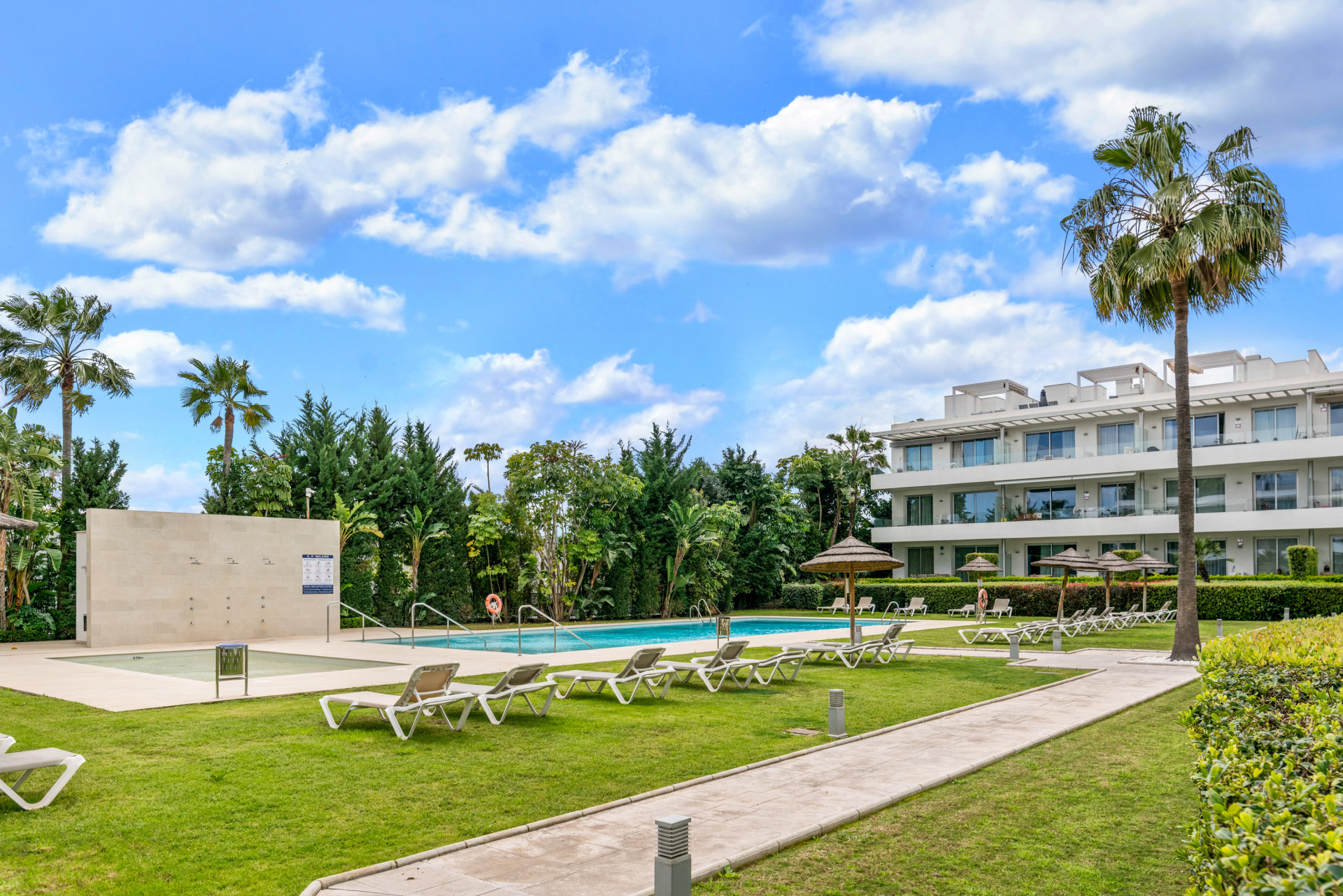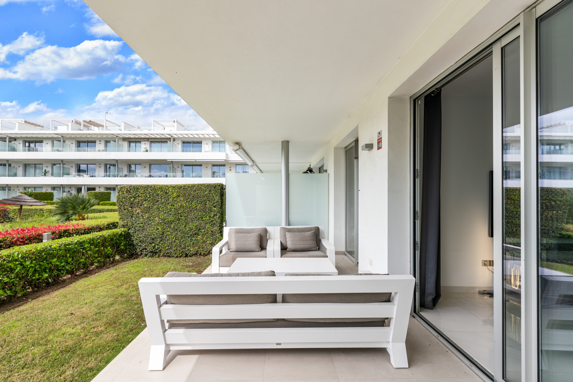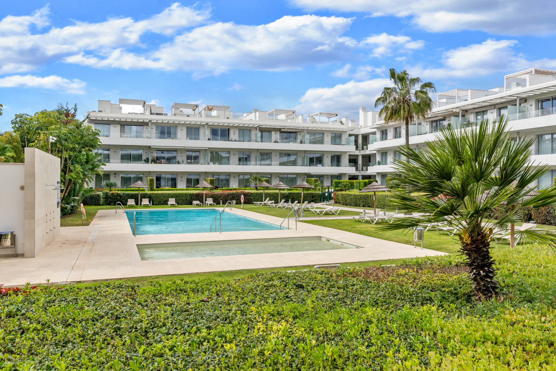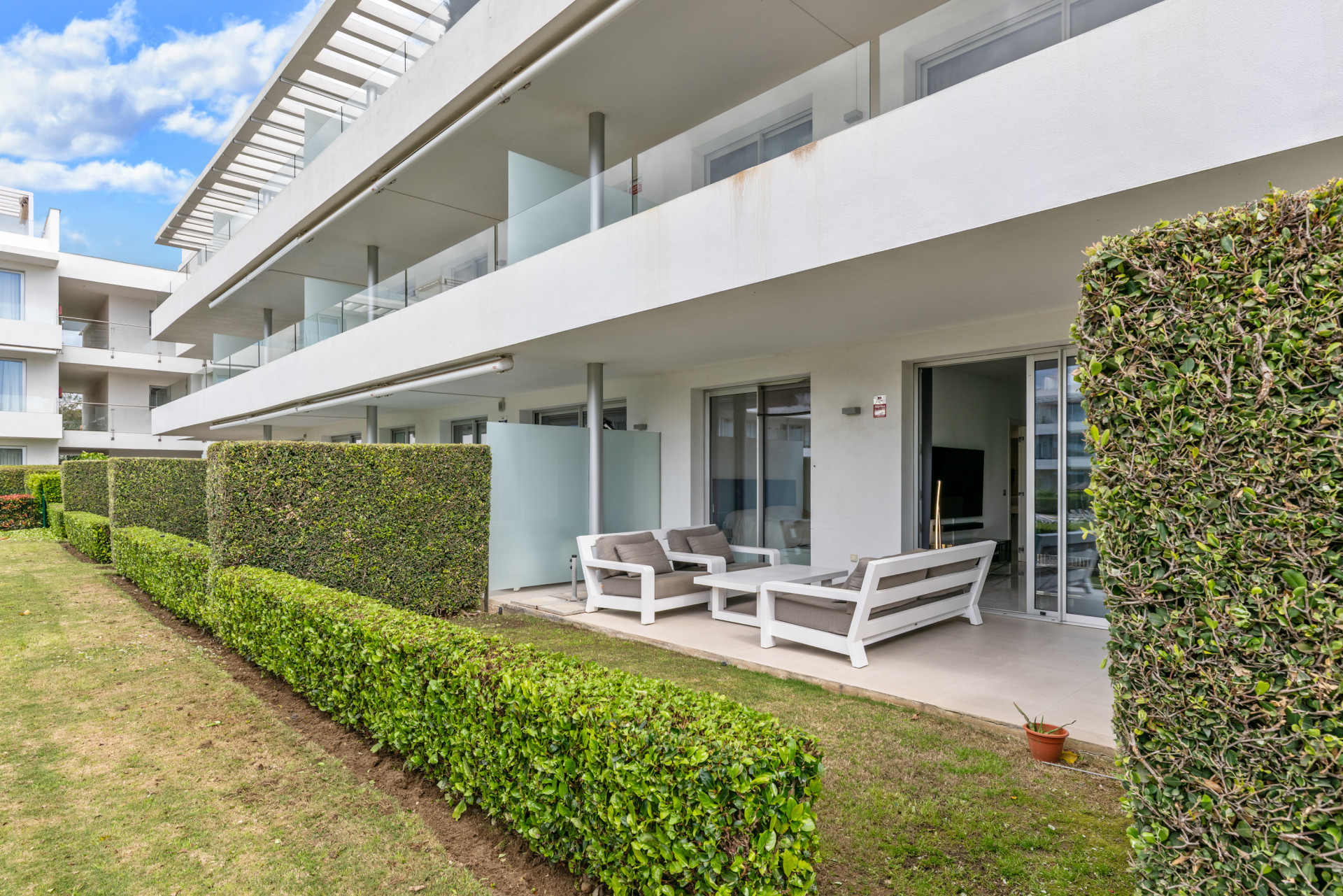 Modern, two bedroom, ground floor, west facing apartment with afternoon sunshine and direct access to the community gardens and swimming pool.