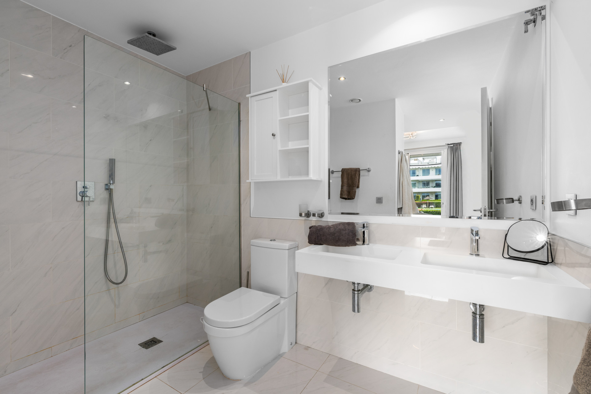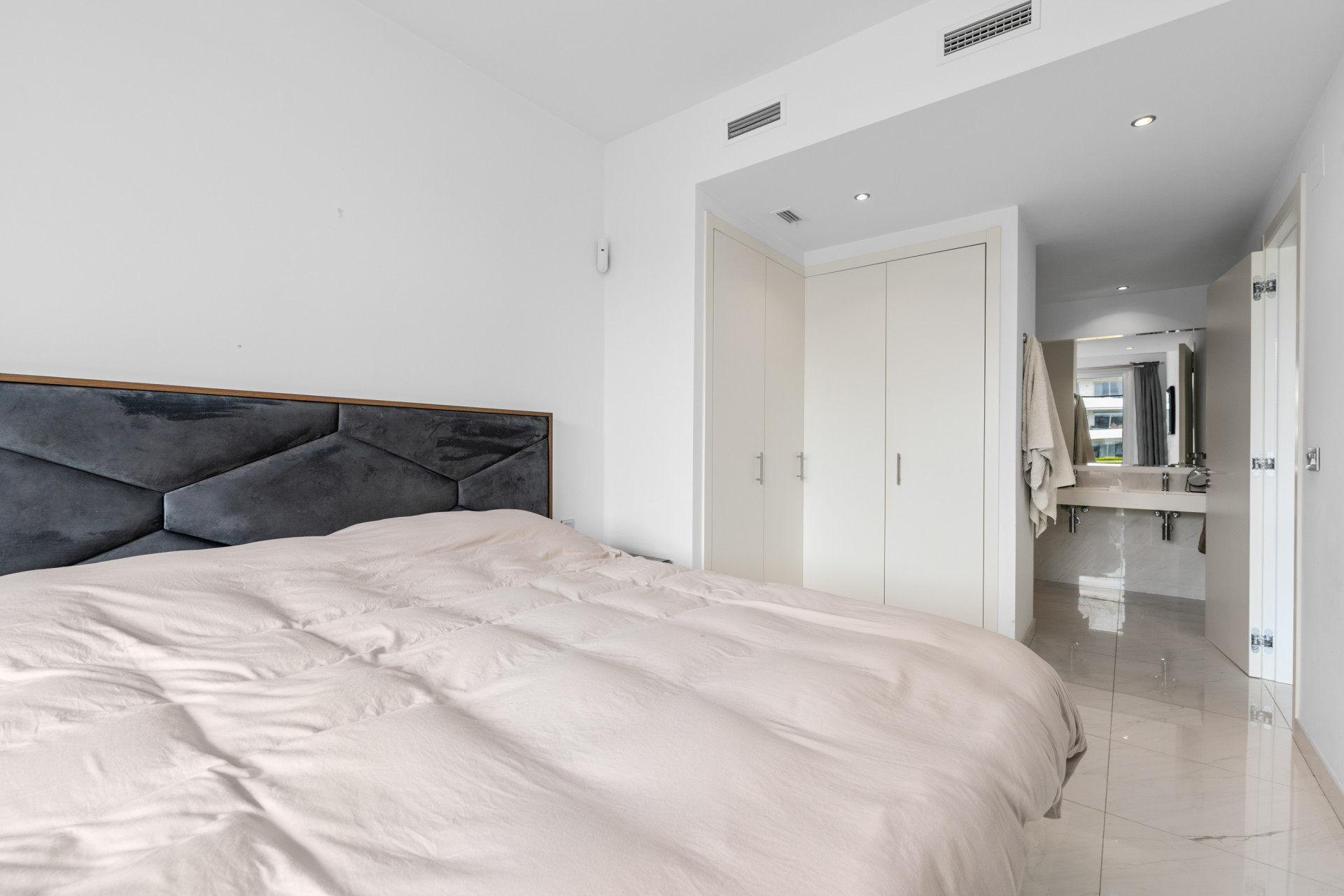 The property has two bedrooms, both with fitted wardrobes. The principal bedroom has an ensuite bathroom and direct access to the spacious private terrace.